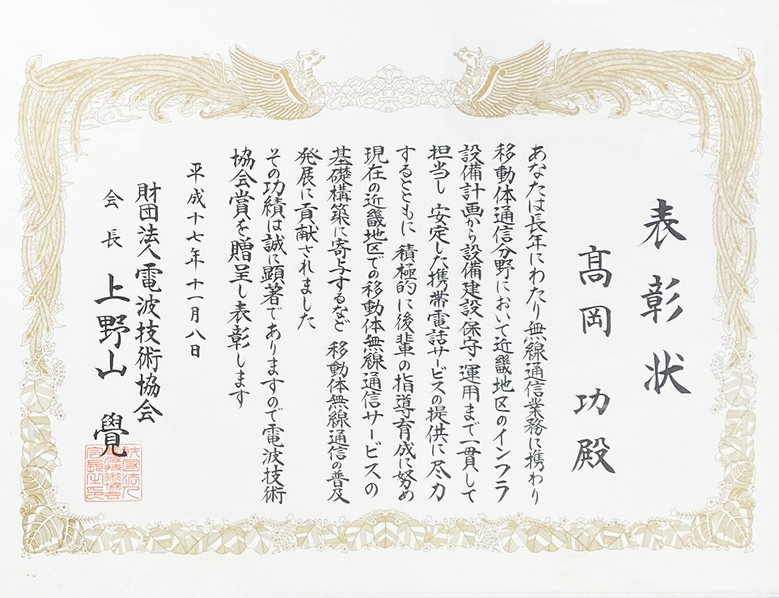 【表彰状】高岡功殿、あなたは長年にわたり無線通信業務に携わり、移動体通信分野において、近畿地区のインフラ設備計画から、設備建設・保守・運用まで一貫して担当し、安定した携帯電話サービスの提供に尽力するとともに、積極的に後輩の指導育成に努め現在の近畿地区での移動体無線通信サービスの基礎構築に寄与するなど、