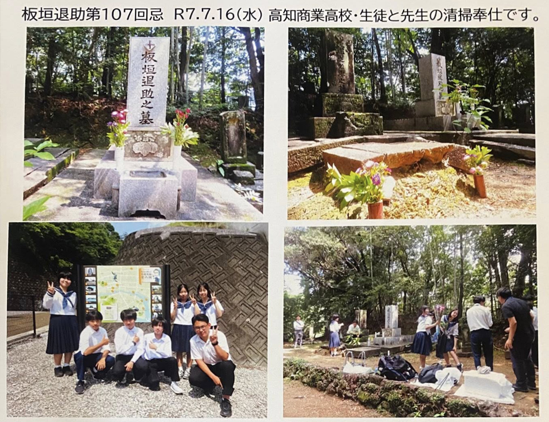 平素は薊野三五老人クラブさまにより、静謐に保たれている墓所ですが、7月16日の板垣先生ご命日当日は、午前中に高知商業高校教師さま・生徒さまによる板垣山清掃奉仕があり、墓所は非常に静謐に保たれていました。熱い中ありがとうございました!