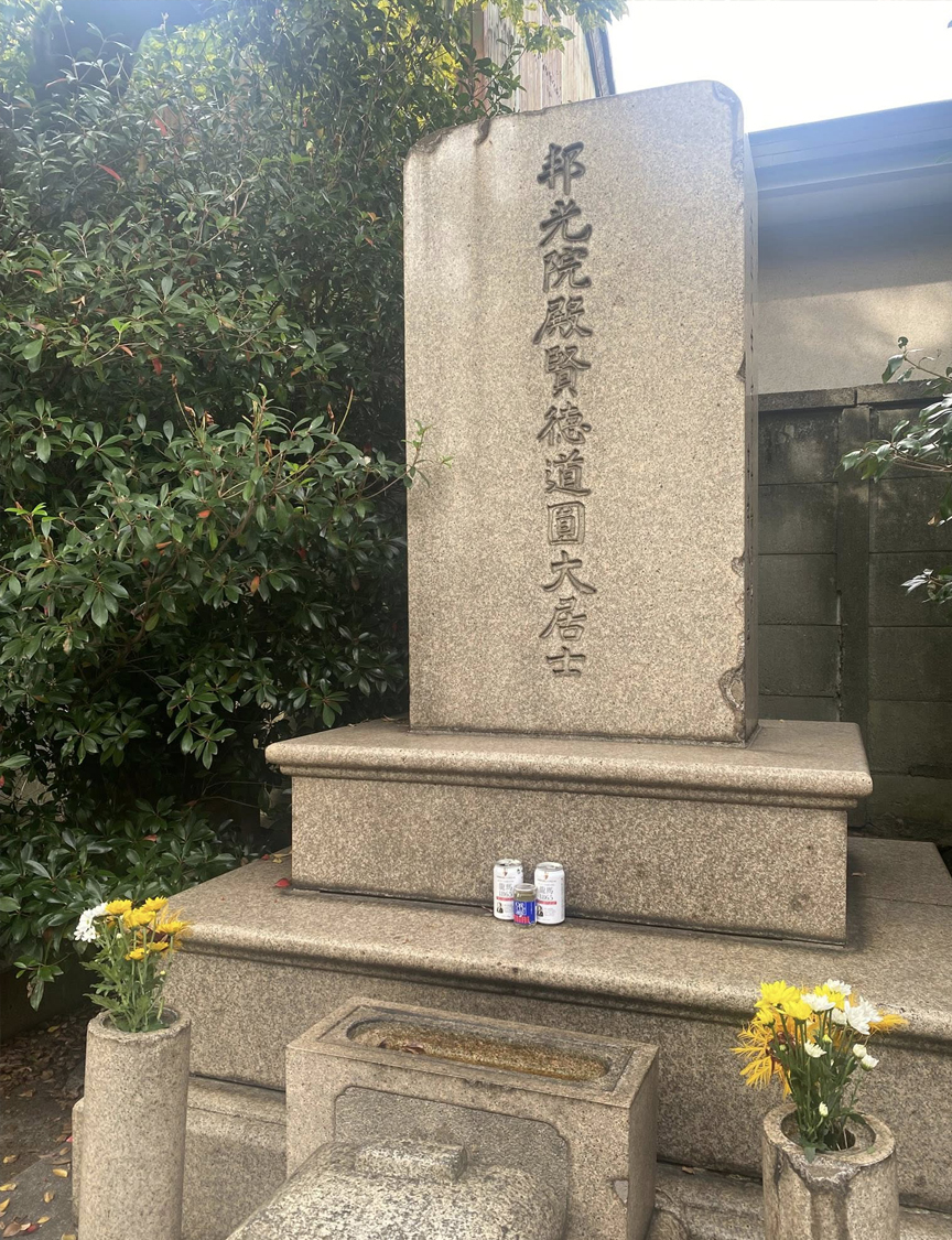 途中商店街で花を用意し、東京品川の板垣の奥都城を参ると、墓前には前参拝者によって「坂本龍馬先生のビール」が2本が捧げられていました。