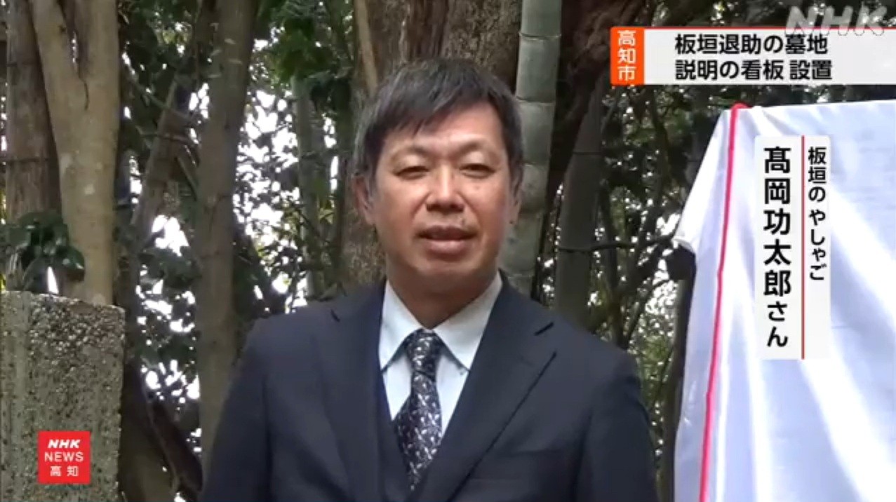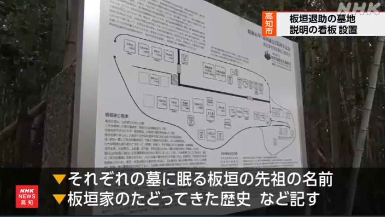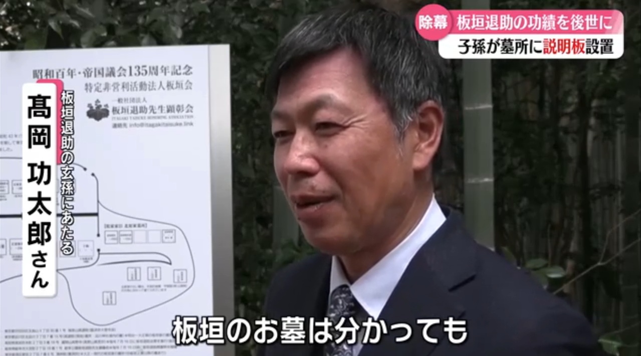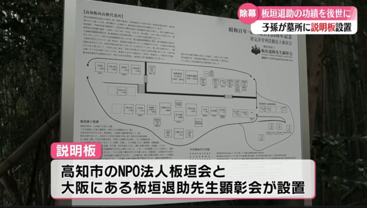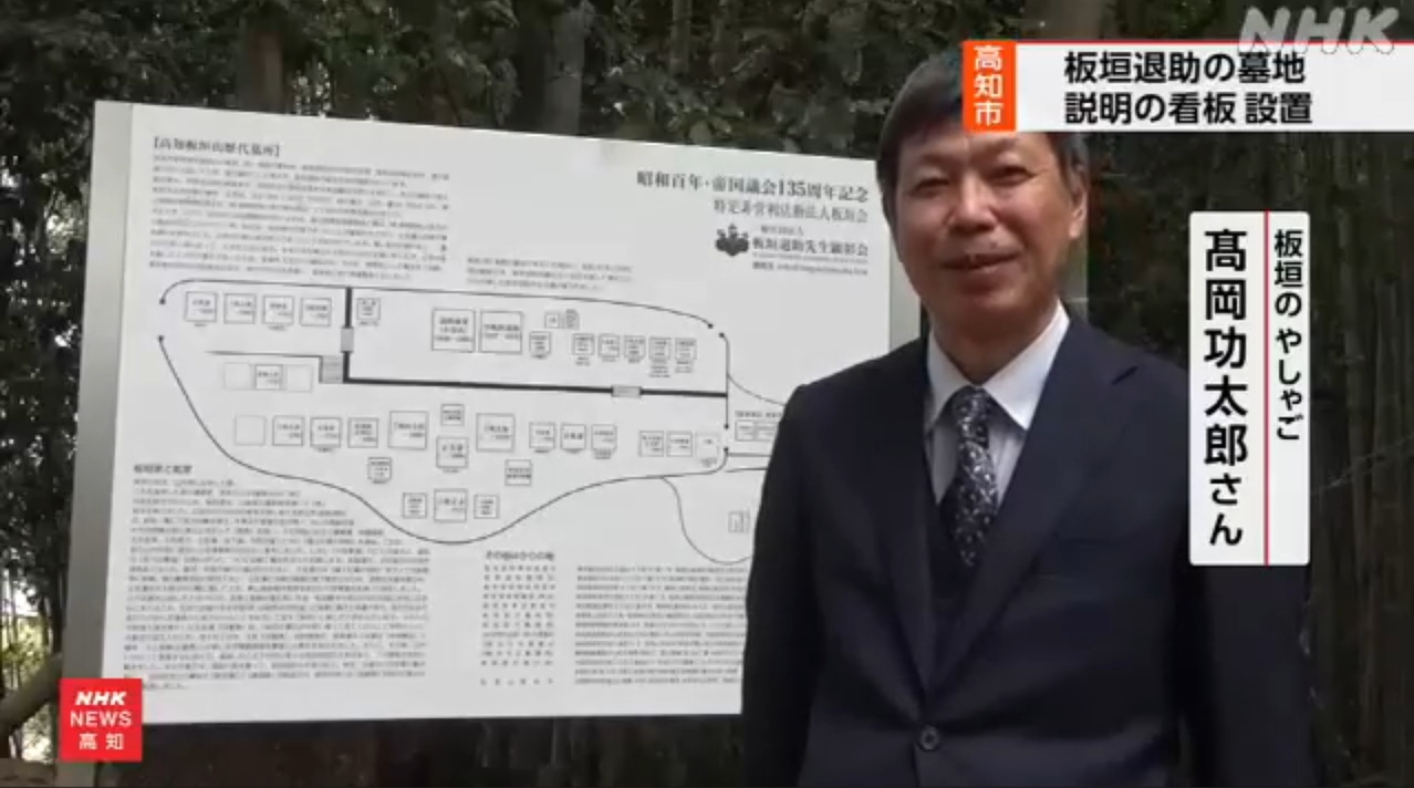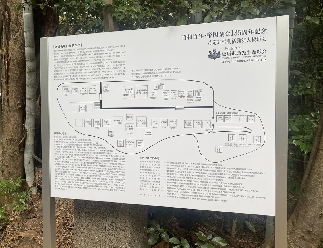 板垣退助百回忌より前から計画していたものの、百回忌の年は(高知・岐阜・東京)記念式典、特別位牌(2基)作製、記念講演、記念書籍編纂に明け暮れ、翌年は京都祇園の石碑建立と立て続けに記念事業が重なり、案内板の建立出来ず、やむを得ずA3サイズの用紙に印刷しラミネートした案内図を仮設していた。