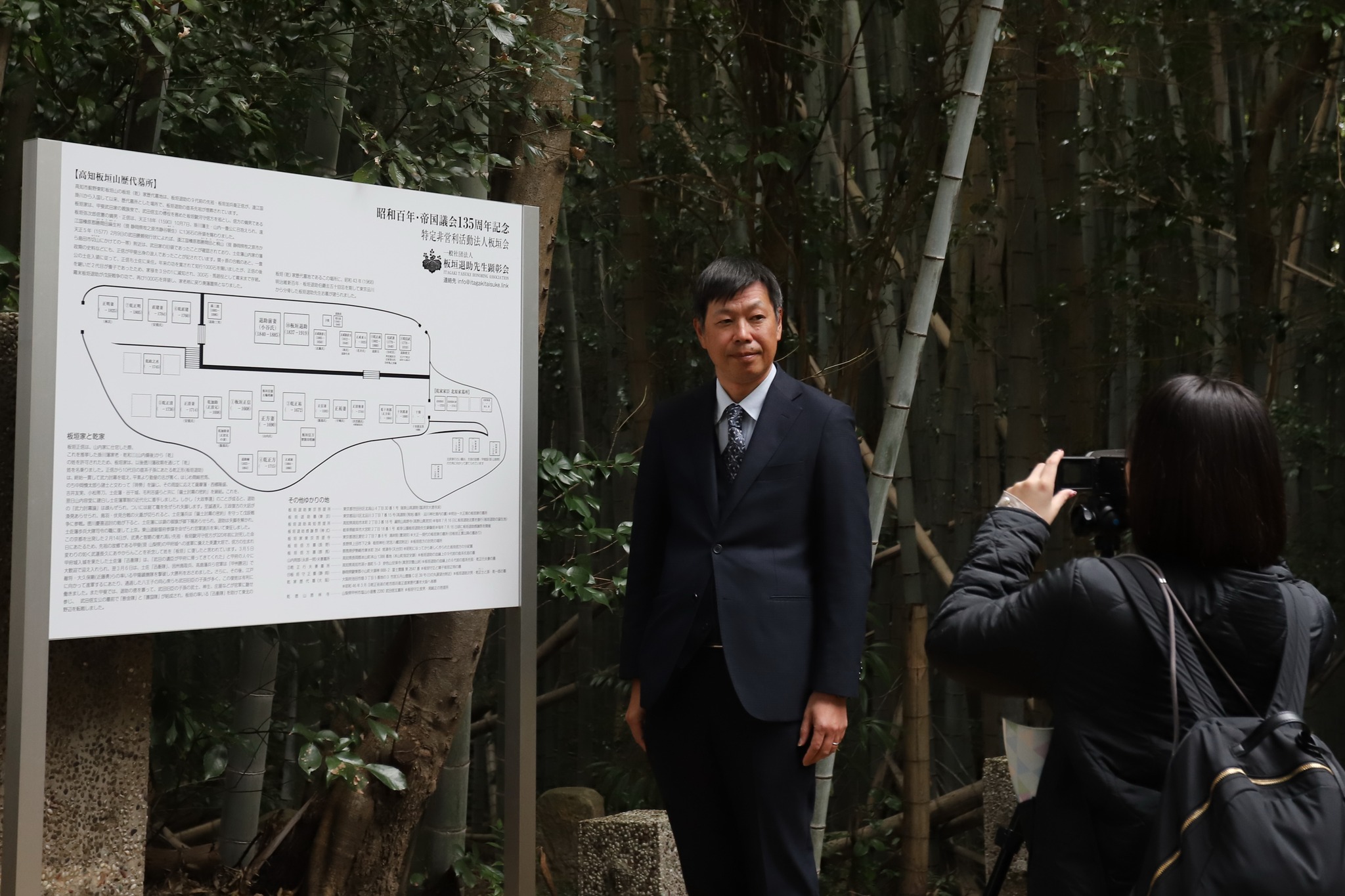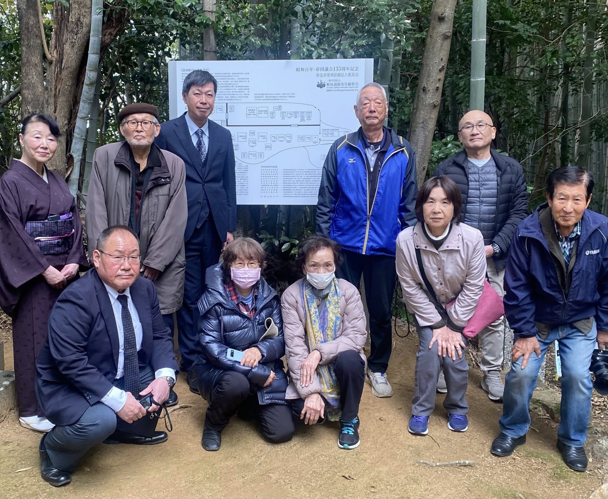 板垣退助百回忌より前から計画していたものの、百回忌の年は(高知・岐阜・東京)記念式典、特別位牌(2基)作製、記念講演、記念書籍編纂に明け暮れ、翌年は京都祇園の石碑建立と立て続けに記念事業が重なり、案内板の建立出来ず、やむを得ずA3サイズの用紙に印刷しラミネートした案内図を仮設していた。