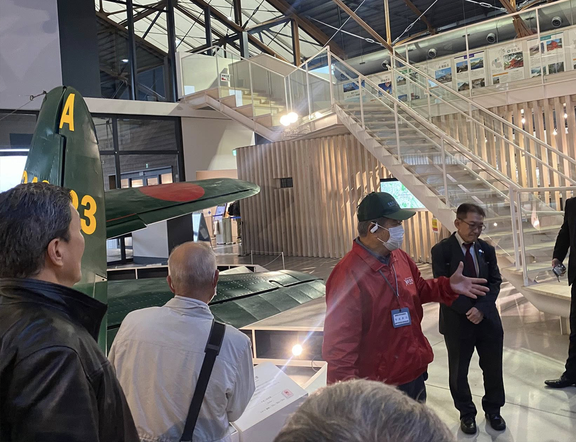 髙岡功太郎理事長の母方のお爺さまは、高知歩兵第44連隊に属し、昭和12年8月12日、支那事変に際し応召出征されました。同年8月23日の早暁、呉淞鎮付近に於て果敢な敵前上陸を敢行し、羅店鎮の戦闘で戦傷。そして、父方のお爺さまは戦時中に紫電改の製造に従事しておられたとのことで、鶉野飛行場跡【紫電改】を含め防空壕、滑走路跡など戦時史跡を巡る今回のこの企画に参加。鶉野飛行場資料館館長・上谷哲朗さまより、直々にご説明を賜り、大いに学ぶ処がありました。